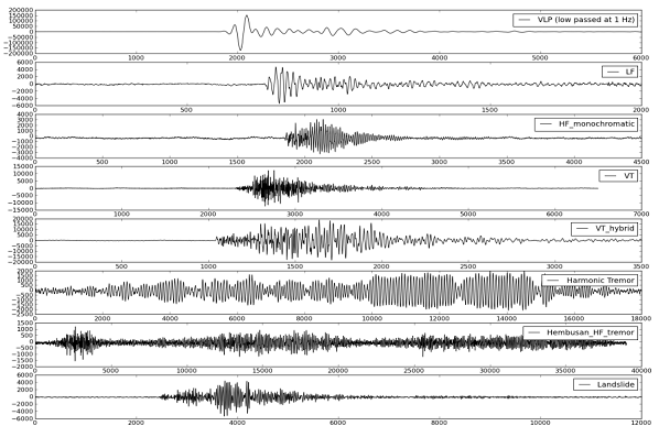 Volcano monitoring traditionally starts with detecting, identifying, locating and classifying seismic events. These events can be classified as, for example, "Volcanic A" (shallow volcano-tectonic event), "Volcanic B" (deep volcano tectonic event), "Tectonic", "Distant Tectonic", "Long Period", "Monochromatic", "Rockfall", etc. (Caudron et al., 2015 [3]). The classification of these events is based on the observer’s or scientist’s experience and also on different parameters or features of the seismic record. Differences between event types are present in their duration, the time difference between the arrivals of two different types of wave trains, their frequency content or the way energy is released in the coda (tail) of the event.