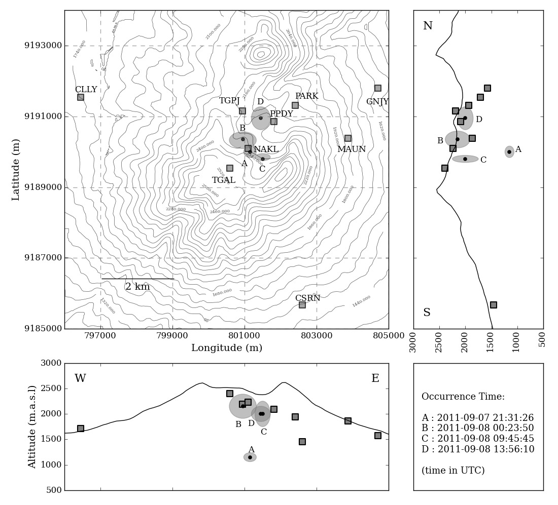 Figure 5: Location of the volcano-tectonic and tectonic events during the 2011-2012 crisis of the Kawah Ijen volcano.