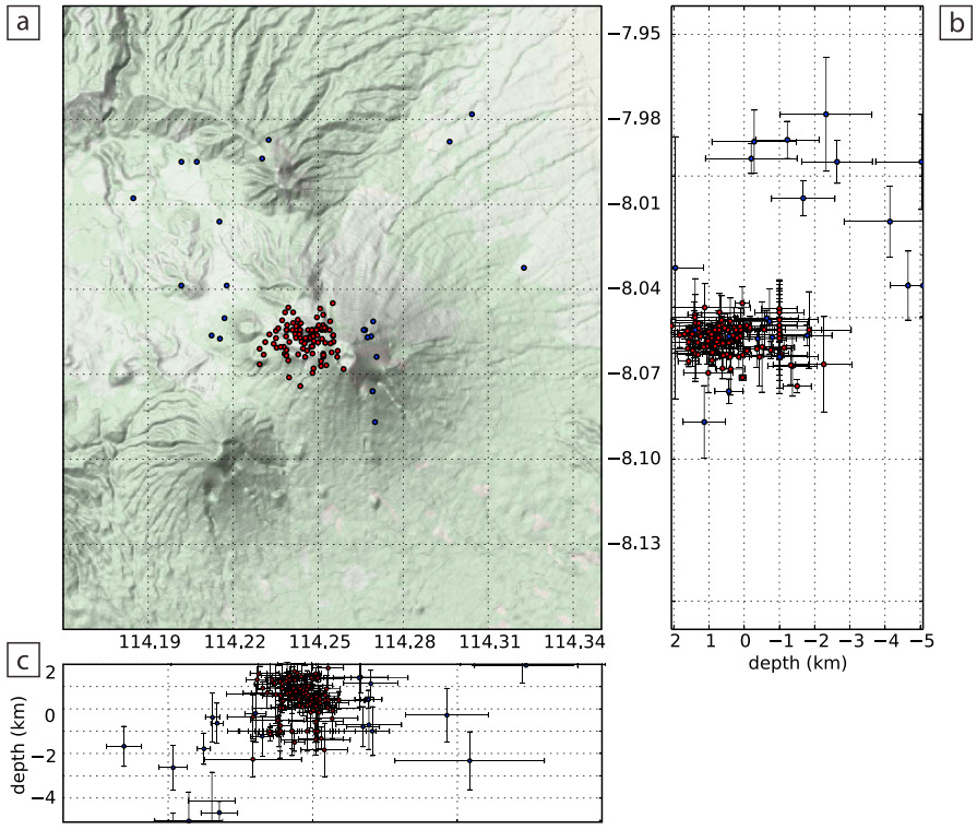 On the Kawah Ijen volcano, a specific focus has been set on the events preceding the 2011-2012 unrest of the volcano (Caudron et al., 2015 [2]). During that period, 237 earthquakes were locatable using all available seismic stations. Most of the events occurred at a depth of 1 km below the crater lake. Some events occurred further away in or outside of the Ijen Caldera. These events are important in the dynamic triggering of the activity of volcanoes, i.e. the chain reaction between an event and the state change of the volcanic system and is now an active area of research worldwide.