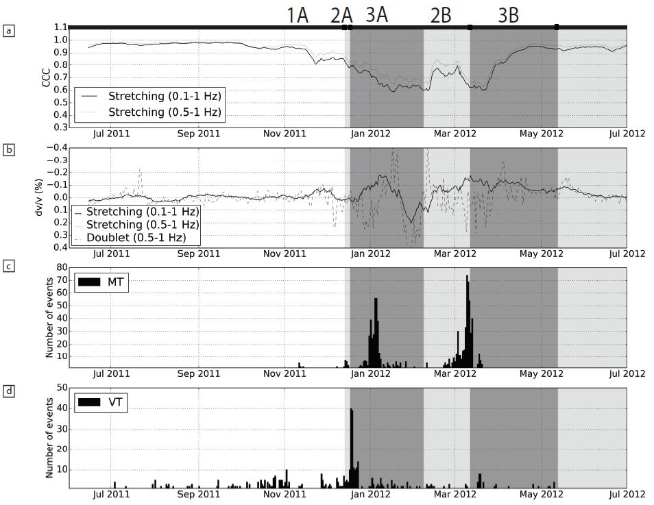 Figure 6: Comparison of decorrelation (a), relative velocity variation (b), tremor event rate (c) and volcano tectonic event rate (d) during the 2011-2012 Kawah Ijen crisis.