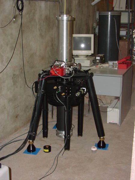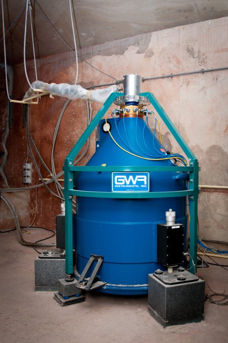 The calibration factor of relative spring gravimeters often suffers from time variations and their measurements present a strong time drift too. Therefore, the Observatory installed a superconducting gravimeter in 1995 at the Membach station, near Eupen, and another one in Rochefort end 2014. In such an instrument, the spring suspension is replaced by the magnetic levitation of a superconducting sphere, generated by constant currents trapped in two superconducting coils. The sphere and the coils are temperature regulated to –269°C and this provides a highly sensitive gravimeter that is stable for long periods. The superconducting gravimeter measures g variations with a precision a hundred times better than the spring instruments. In contrast with spring gravimeters, the superconducting gravimeter is not mobile, however.