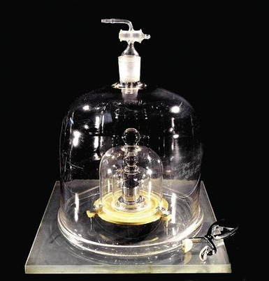 Figure : International prototype « K » of the kilogram conserved at the Bureau International des Poids et Mesures in Sèvres, France (credit : http://www.bipm.org/en/bipm/mass/prototype.html).