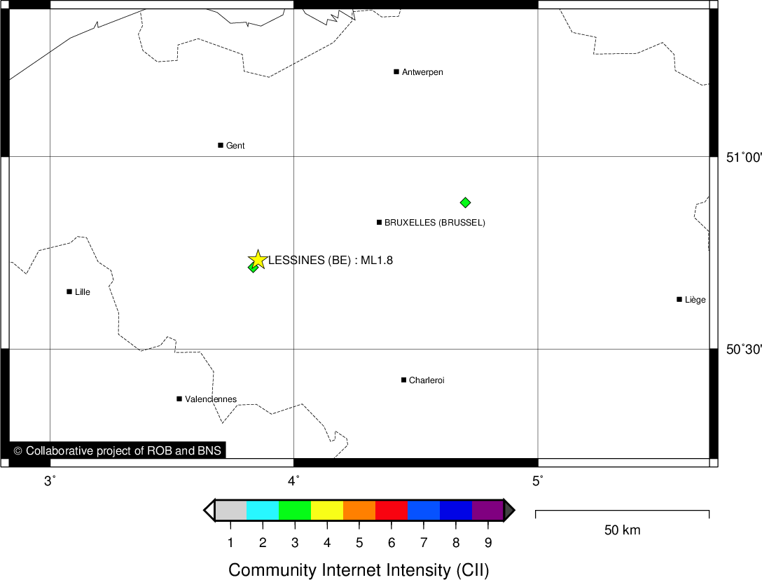| Epicentral coordinates | 50.732° N, 3.852° E Uncertainty ± 3.6 km |