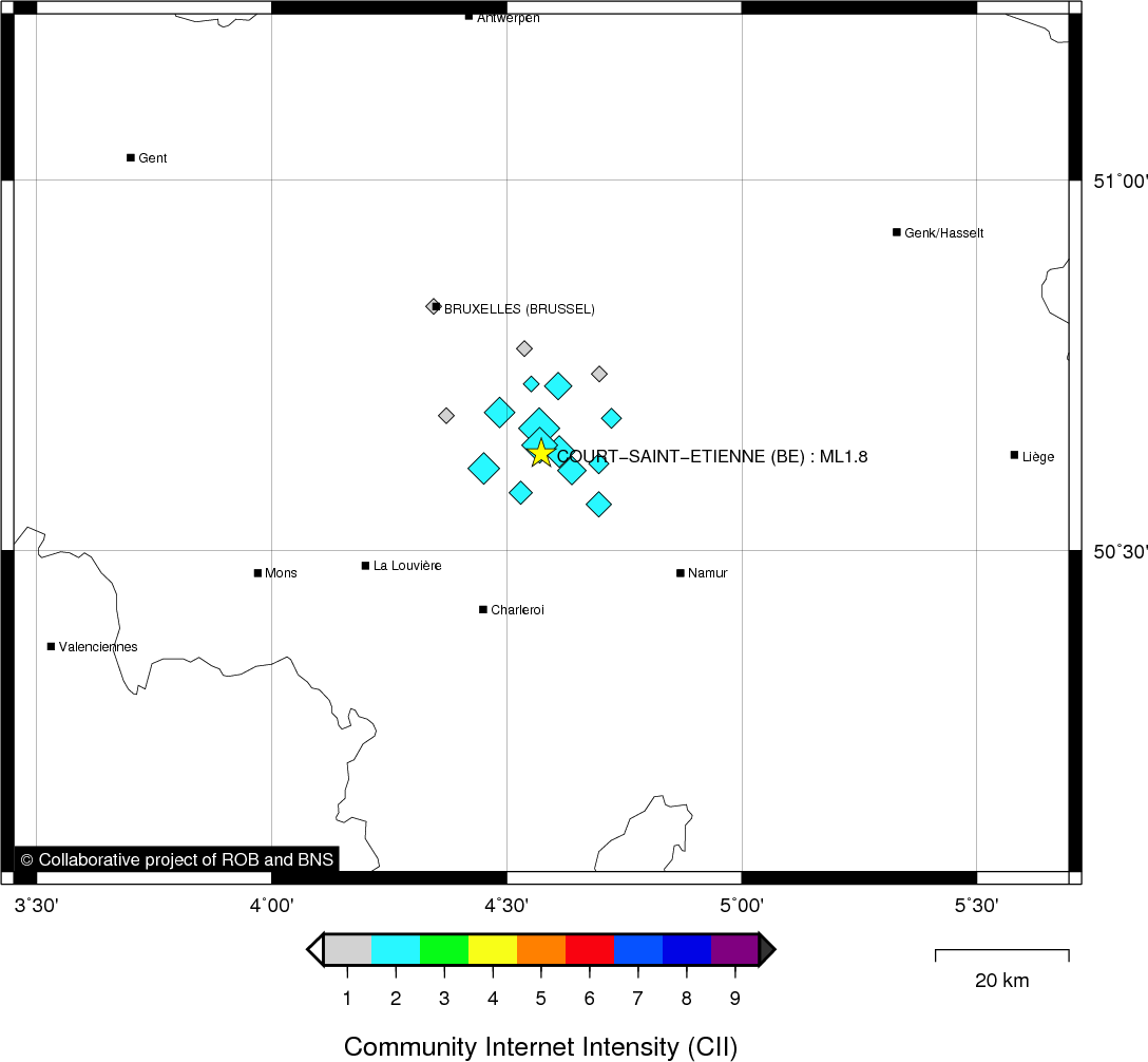 | Epicentral coordinates | 50.632° N, 4.574° E Uncertainty ± 0.6 km |