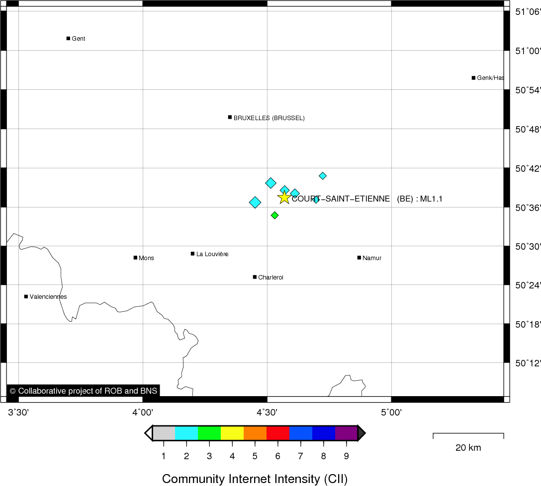 | Epicentral coordinates | 50.624° N, 4.570° E Uncertainty ± 0.6 km |
