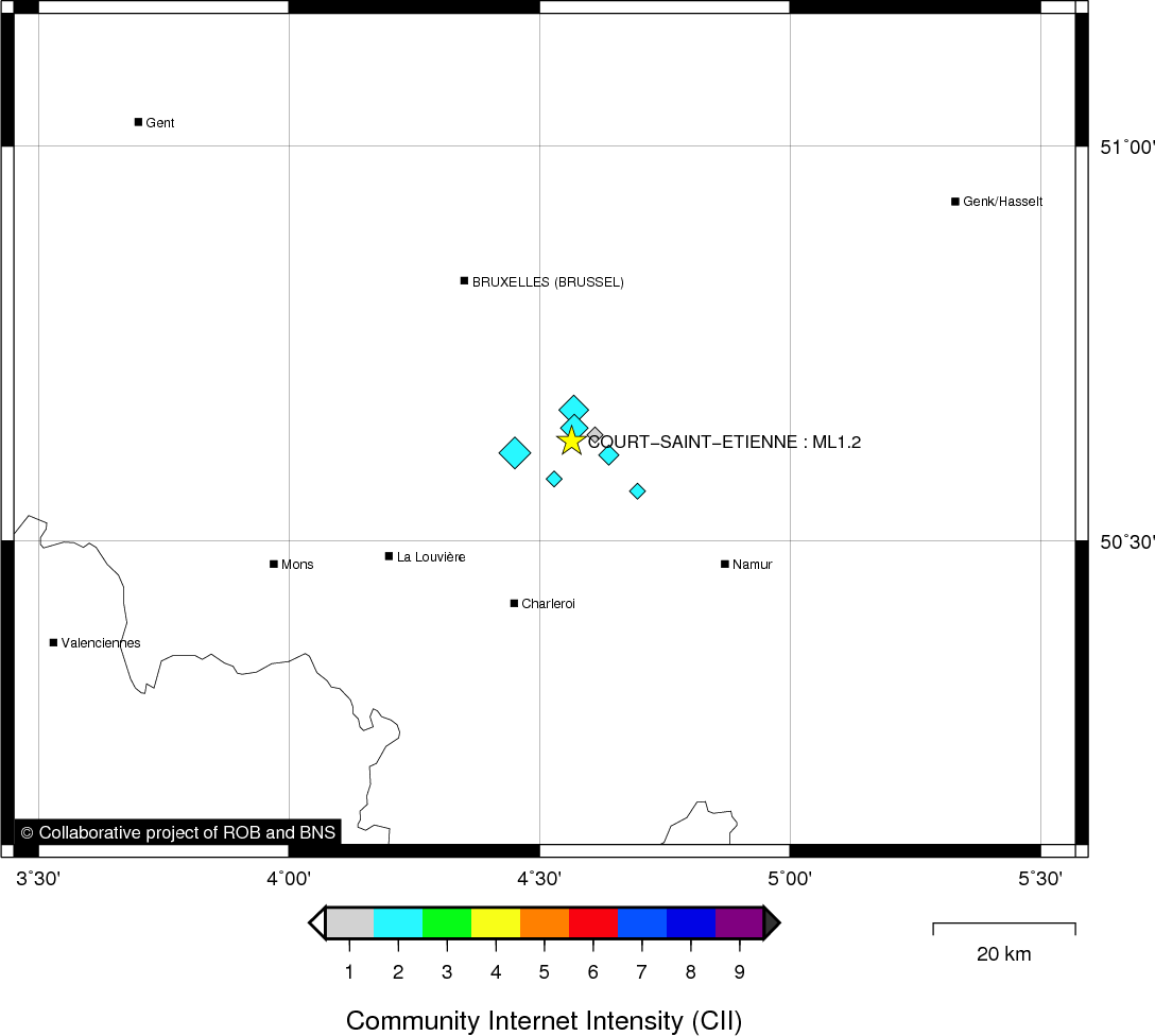| Epicentral coordinates | 50.627° N, 4.565° E Uncertainty ± 0.9 km |