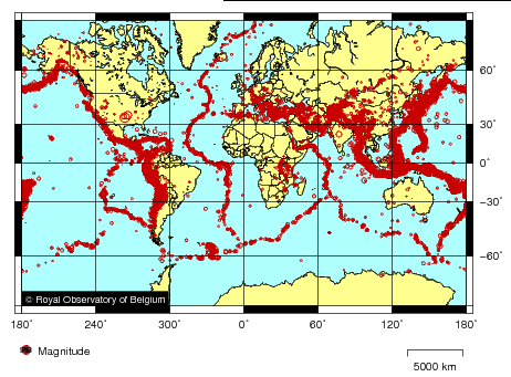 Sur la carte suivante, les cercles rouges représentent les séismes de magnitude supérieure à 5.0 qui sont survenus entre le 1er janvier 2000 et le 31 décembre 2010 dans le monde.
