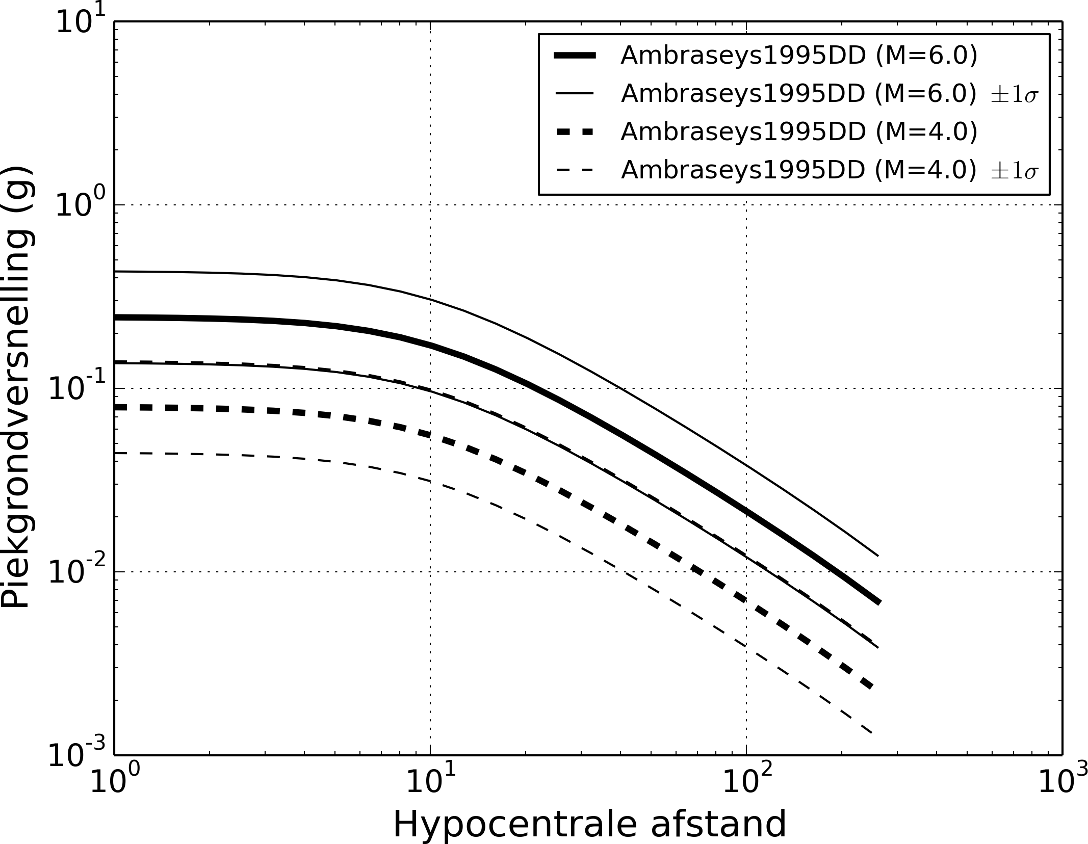 grondversnellingsniveau in functie van de magnitude van een aardbeving en de
