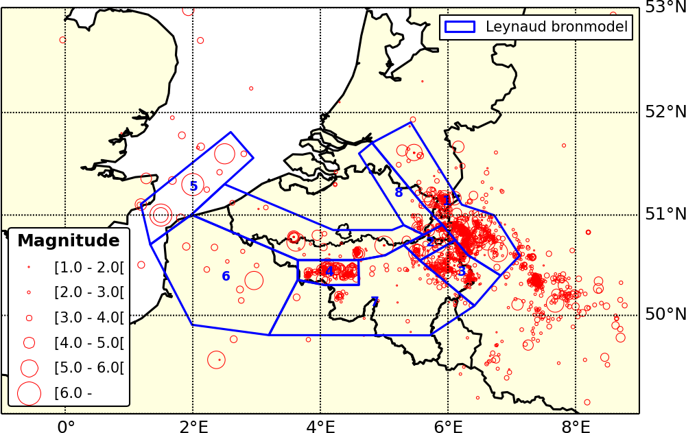 Figuur 1 - Seismische bronzones in en rond België volgens het Leynaud-model. In dit model worden 9 zones onderscheiden: Roerdalslenk (1), Luik-Voeren (2), Hoge Venen (3), Henegouwen (4), zuidelijke Noordzee (5), Brabantmassief (6), Noord-Frankrijk (7), Ardennen (8) en Limburg (9). Dit bronzoneringsmodel werd toegepast bij de berekeningen voor Eurocode 8, maar sindsdien werden twee nieuwe zoneringsmodellen ontwikkeld die het volledige territorium bedekken