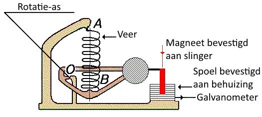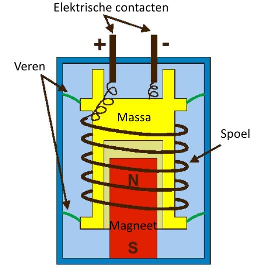We beperken ons hier tot de werking van een verticale seismometer. Deze bestaat uit een massa opgehangen in een behuizing door middel van veren. De massa is omgeven door een wikkeling van draden die een spoel vormt terwijl de aan de behuizing een magneet vast zit. Deze elementen zijn zo opgesteld dat de spoel vrij in het magnetisch veld kan bewegen dat door de magneet wordt opgewekt (zie Fig. 1c).